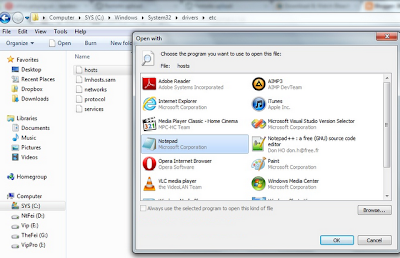 Chú ý: Nếu ko save được dòng trên vào host (Win7), các bạn Click chuột phải vào file host --> Properties => chọn tab "Security".